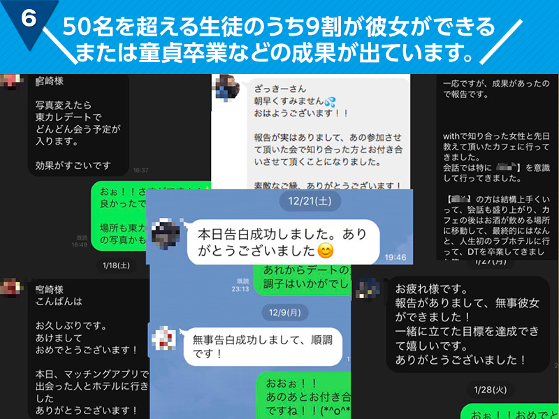 個人差もありますが、多くの方が半年以内に彼女ができる、または童貞卒業などの成果を出されています。